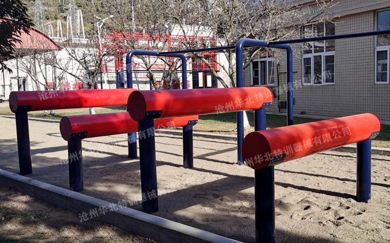 兒童國防軍事障礙單道場地長50米,寬2米。通常為雙道并列設置。項目依次為獨木橋、高欄、斜坡、地籠、矮墻、高板6個項目。  此器械提升參訓人…